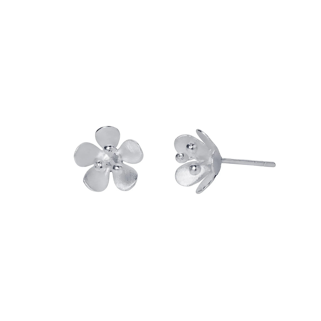 Small daisy flower stud earring handcrafted in sterling silver with satin finish.  The perfect everyday choice for a pretty go-to earring.