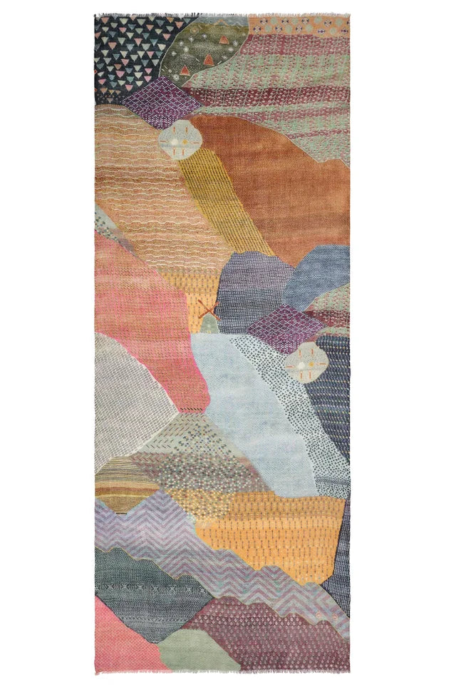 An abstract, tactile and textured piece featuring a rich palette of muted brights. Beautifully soft scarf made from a delicious blend of natural wool and silk