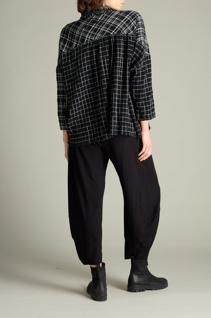 This shirt is cut from crinkled viscose with a textured handle and soft drape. The graphic mini windowpane pattern is subtly broken up by variations in scale and texture, creating movement across the fabric. Dropped shoulders and a boxy silhouette make it a relaxed choice, finished with a classic collar, shell buttons, and a gently curved hem.