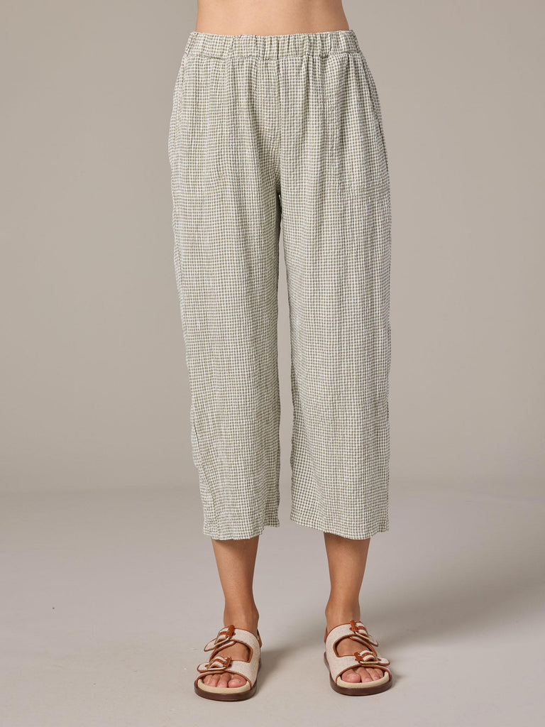 This crinkle check easy crop features an elastic waist, side seam pockets and a straight leg. Stylish and playful, great for holidays and warmer weather.
