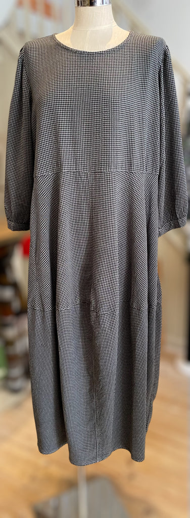 The gorgeous mini check Tencel fabric gives this dress fabulous movement! Round neckline. 3/4 sleeves and bubble shaped for comfort and style.