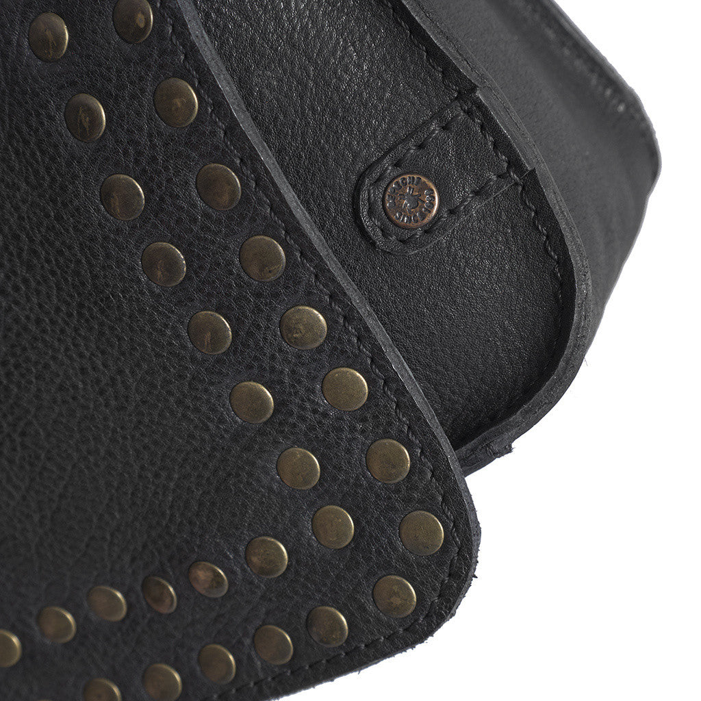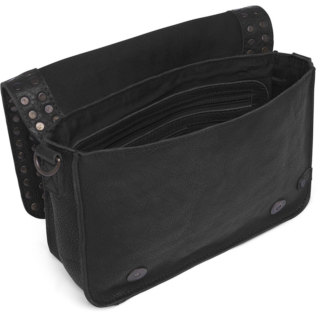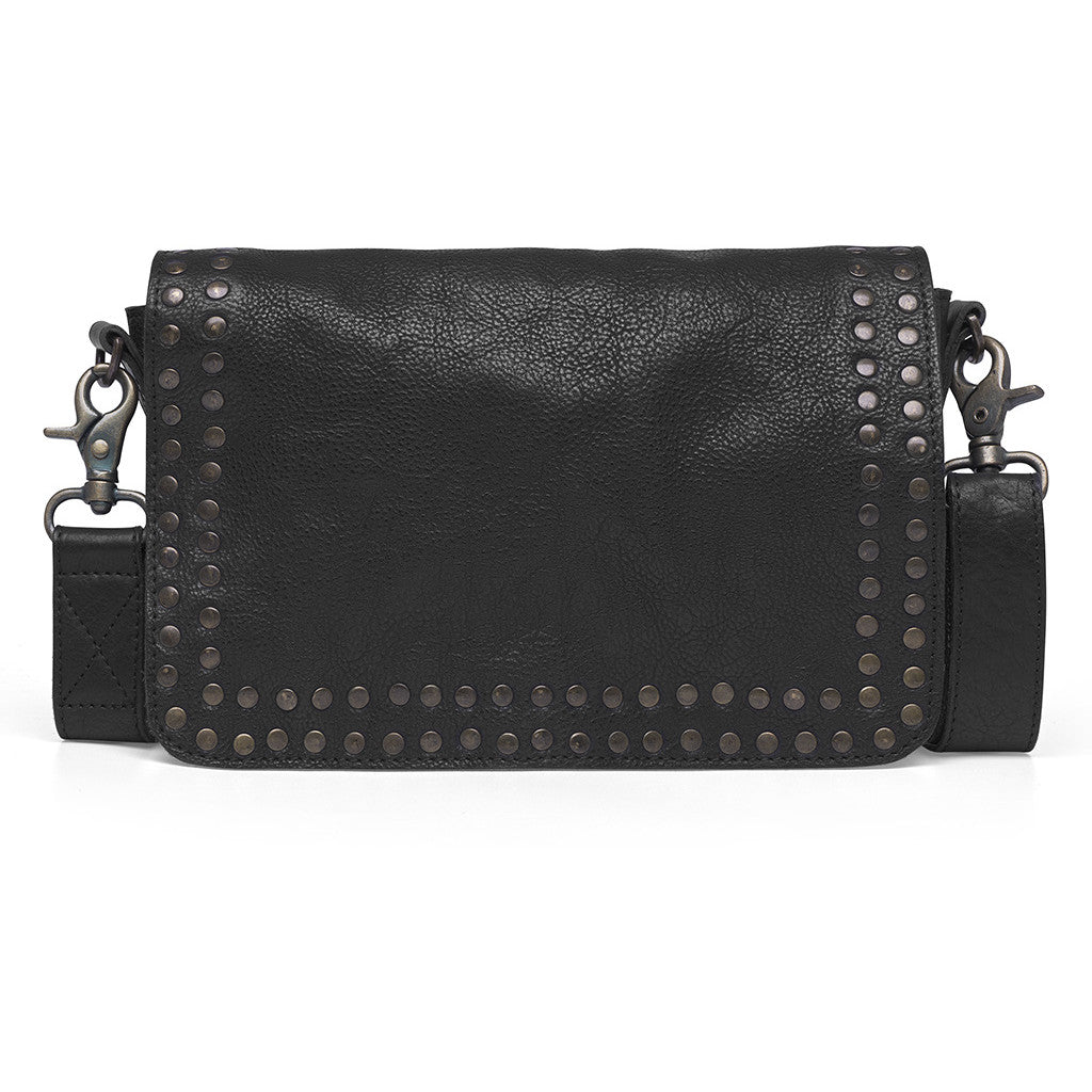This beautiful crossbody bag combines an exclusive and edgy vintage look with practical functionality. Decorated with stunning gold-colored studs on the front, it is sure to elevate your everyday outfit. The bag closes with a flap and two magnetic buttons on the front, ensuring both security and style.