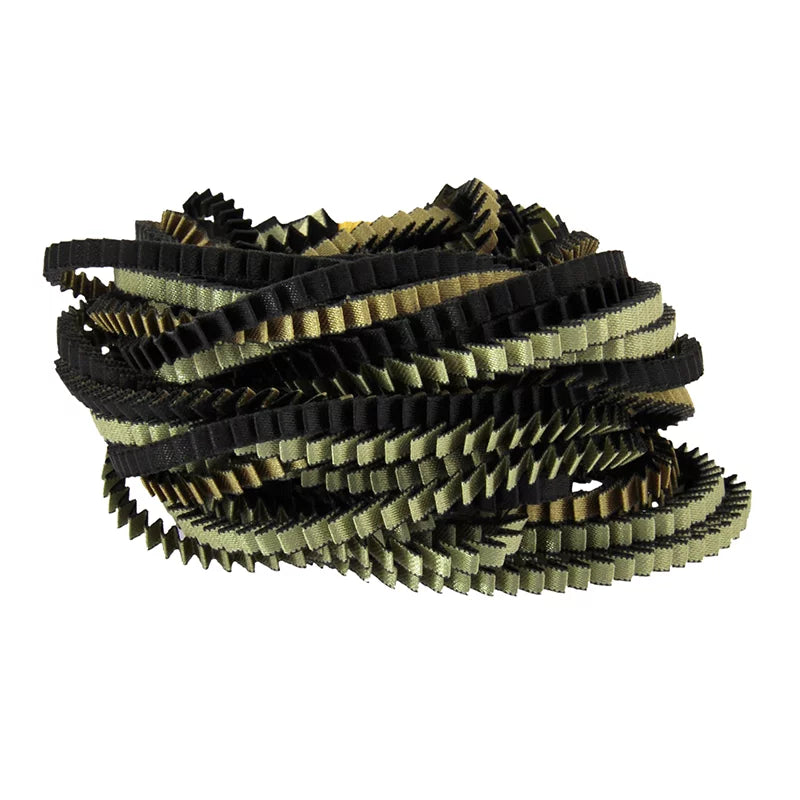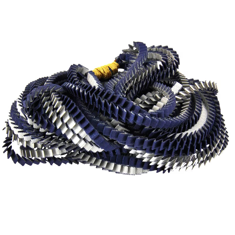 These necklaces are made of pleated satin polyester fabric, which gives them a slight shimmer and ensures their elasticity and durability. Each is composed of eight 3mm wide lines which can be washed, stretched and used at all times, making them fashionably easygoing, both in summer and winter.