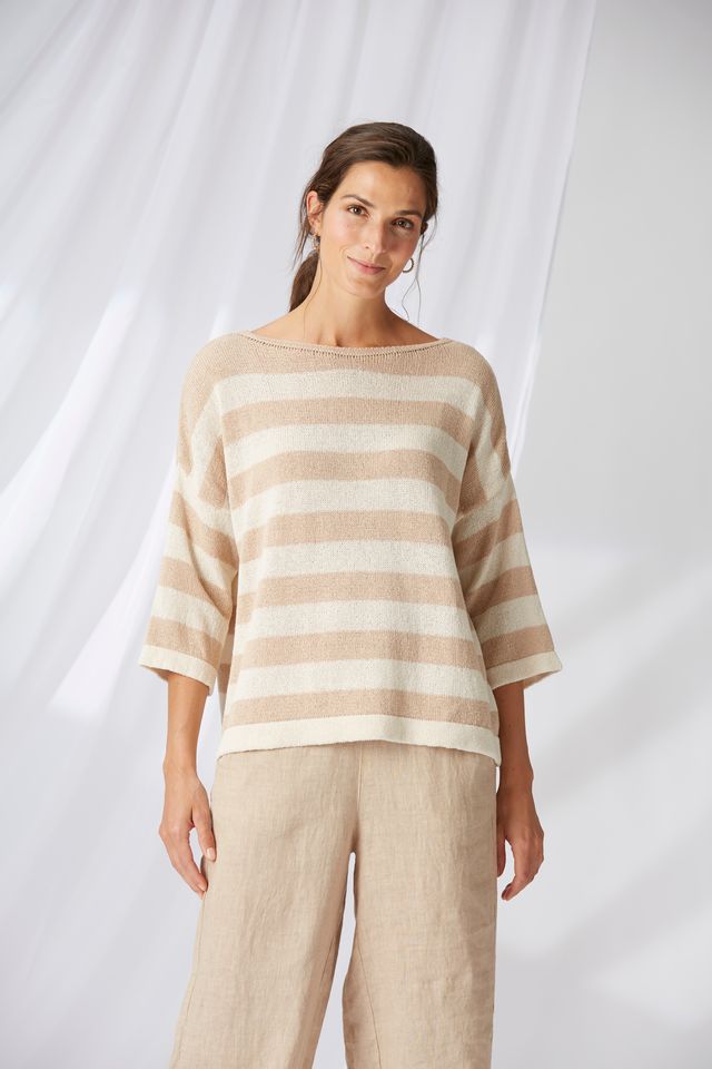 With a round neckline and 3/4 sleeves, this cotton mix knit is boxy in shape in a neutral beige and cream stripe