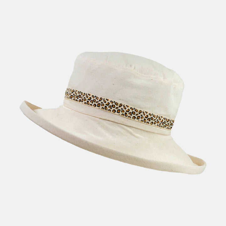 This best selling hat is made from a quality natural coloured cotton with a boned brim and finished with a classic leopard print ribbon band.