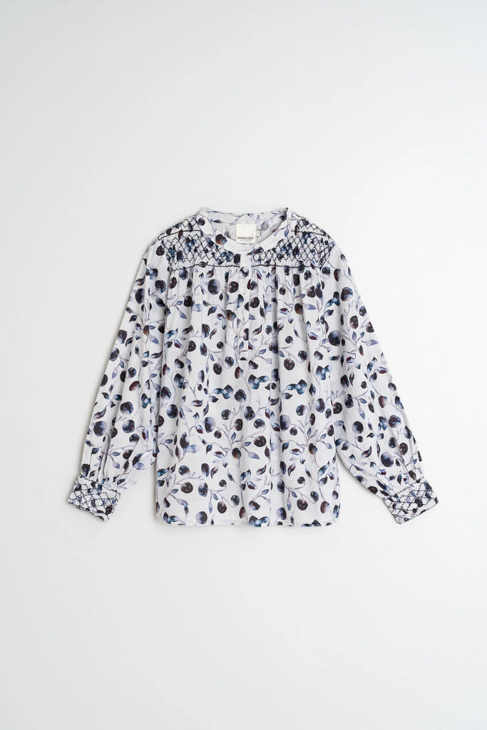 A structured shirt, hand-smocked fitted shoulders and long sleeves with cuffs and button closure and a slight support that gives volume to the garment. It has a half-placket closure and a relaxed fit designed to feel slightly loose and is made from sustainable cotton with a floral motif digital print.