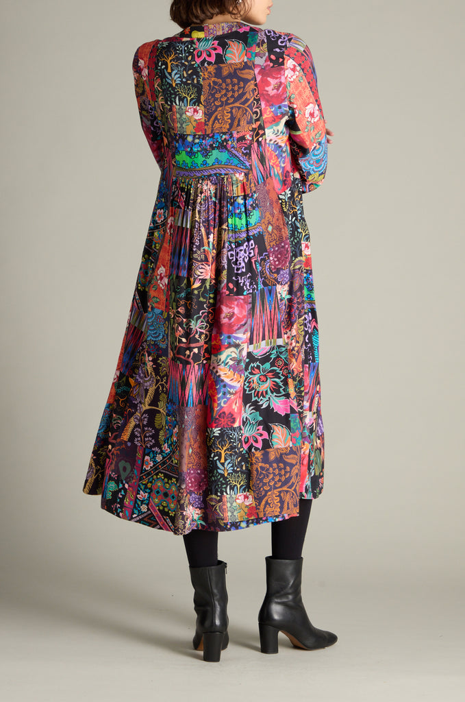 This fabulous midi dress is a riot of colour and pattern. Crafted from pure, breathable viscose, it features a soft stand collar, bracelet-length sleeves with cuff detail, and side seam pockets. Gentle gathers fall from a fixed wrap bib at the front and sides, creating movement through the fit and flare silhouette. A relaxed and easy fit.